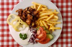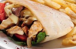 gyros hús, friss zöldségekkel, sültburgonyával, joghurtos-gyros öntettel, pitával