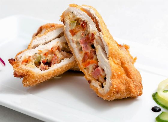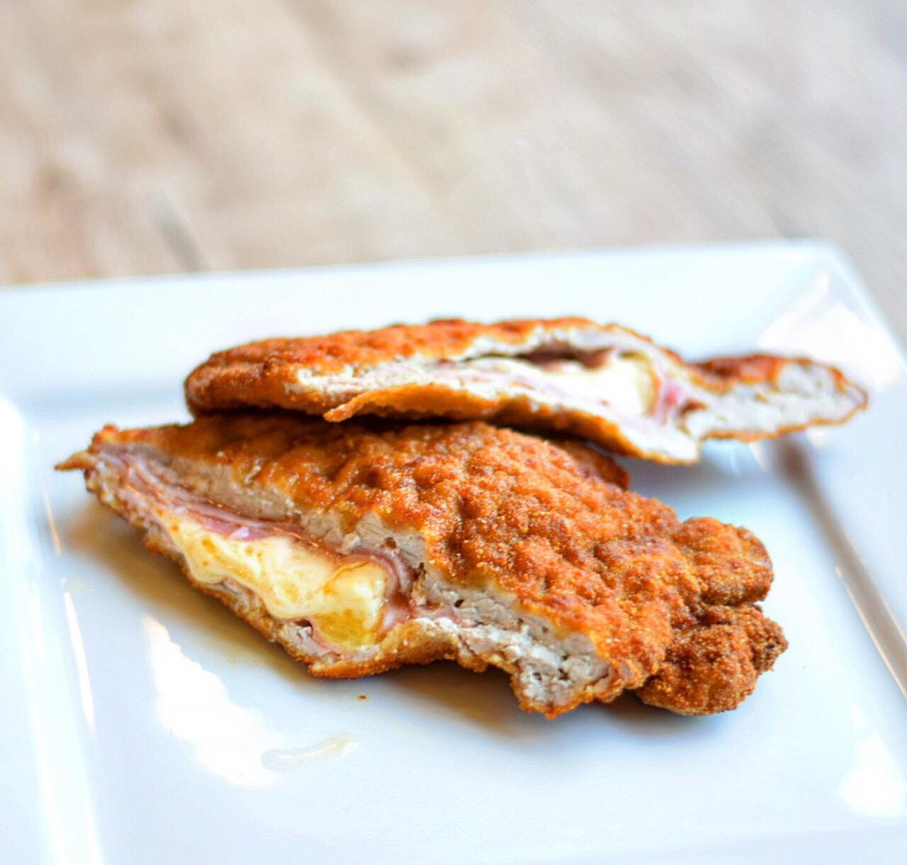 Sonkával-sajttal töltött rántott sertéskaraj (köret nélkül) (kérésre csirkemellből készítjük)