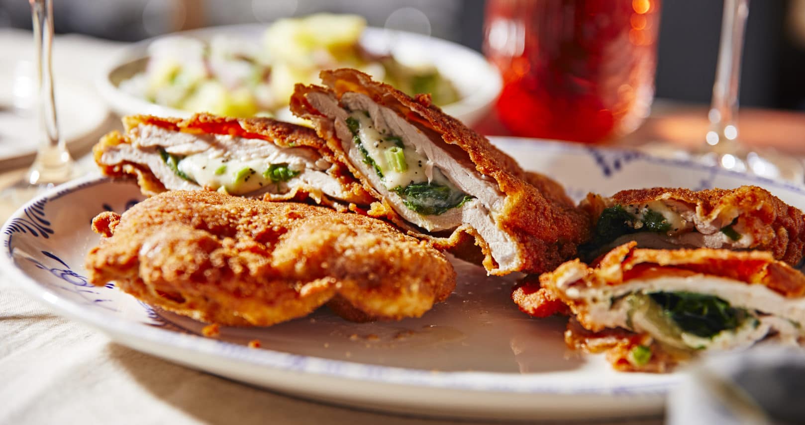 sonkával és spenóttal töltött rántott sertéskaraj (köret nélkül) (kérésre csirkemellből készítjük)