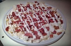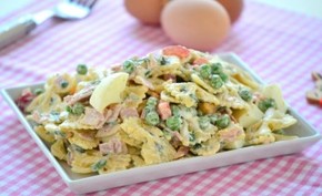 Farfalle (masni) tészta, sült csirkemell csíkok, ananász, tartármártás, füstölt karaván, trappista sajt