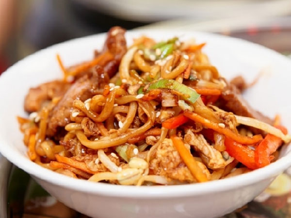 spagetti tészta szója szósszal, csirkemell csíkok, zöldségekkel